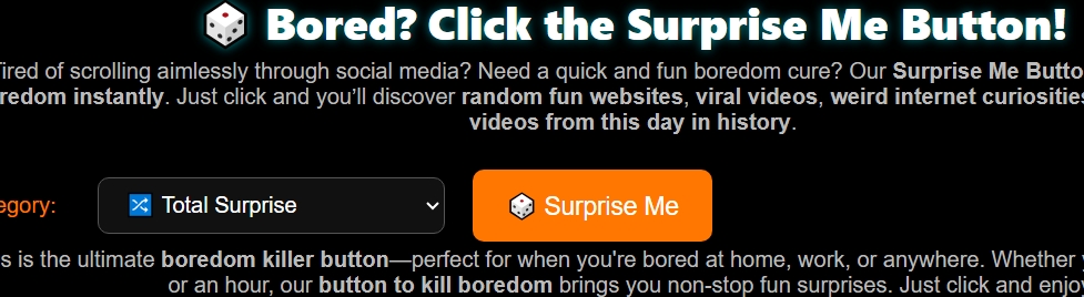 With one click, you’ll dive into a mix of random, ridiculous, and oddly satisfying content from every corner of the internet. It’s not about being productive. It’s about having fun doing absolutely nothing useful.